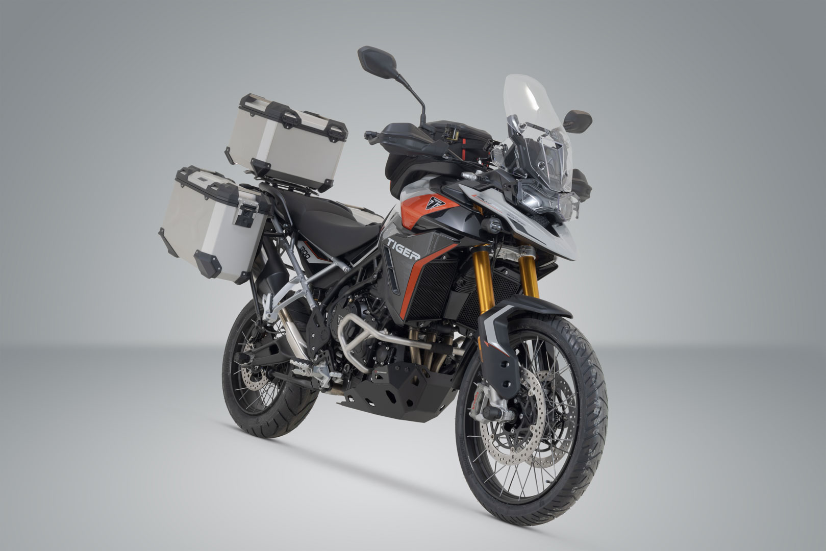 Das Adventure Set TRAX ADV enthält die zur Triumph Tiger 900 GT / Rally Pro passenden PRO-Seitenträger und das passende ADVENTURE-RACK. Die Seitenträger und der Gepäckträger werden an den modellspezifischen Anbaupunkten befestigt und bieten sicheren Halt für die TRAX ADV Alukoffer.