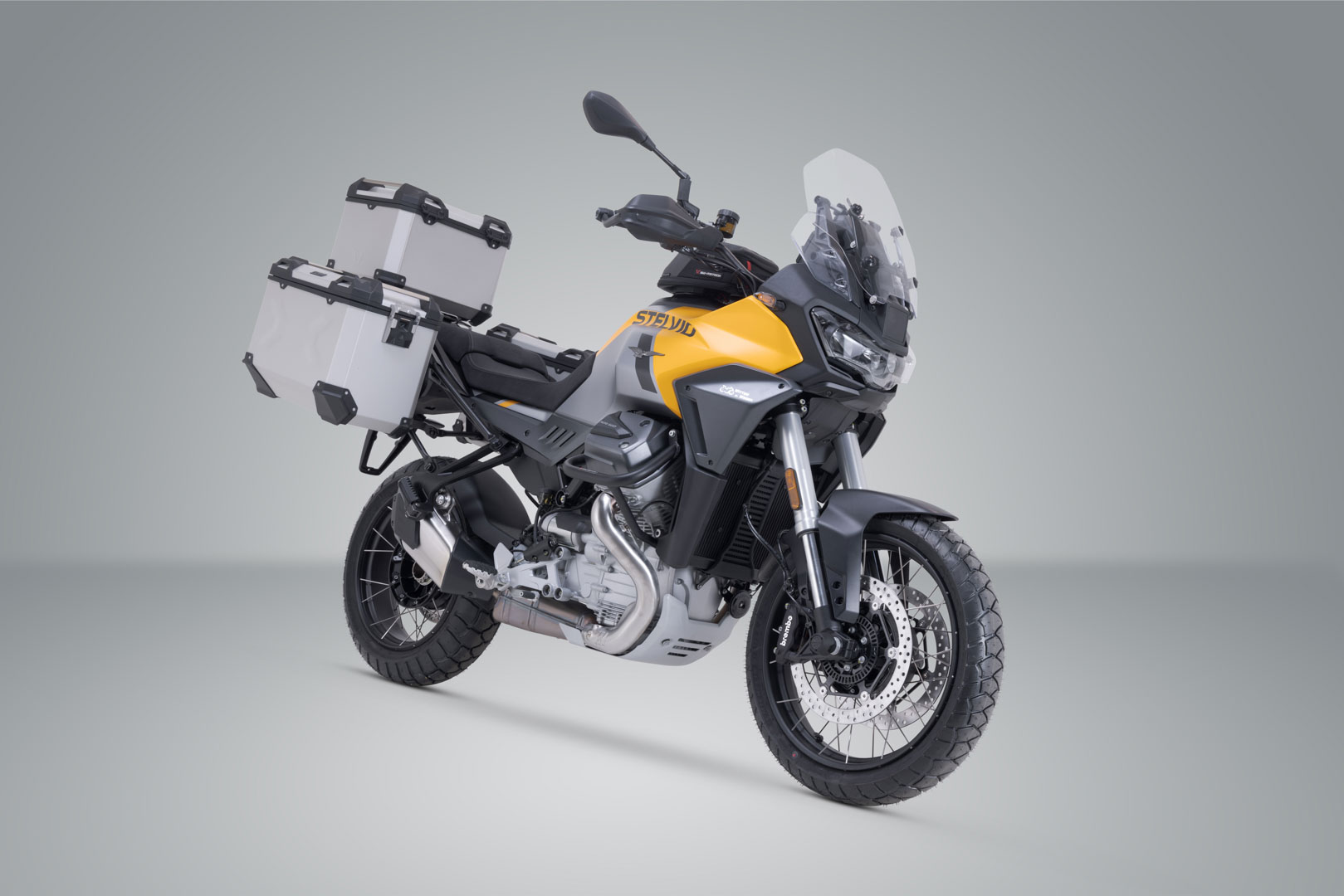 Das Adventure Set TRAX ADV enthält die zur Moto Guzzi Stelvio passenden PRO-Seitenträger und das passende ADVENTURE-RACK. Die Seitenträger und der Gepäckträger werden an den modellspezifischen Anbaupunkten befestigt und bieten sicheren Halt für die silbernen TRAX ADV Alukoffer.