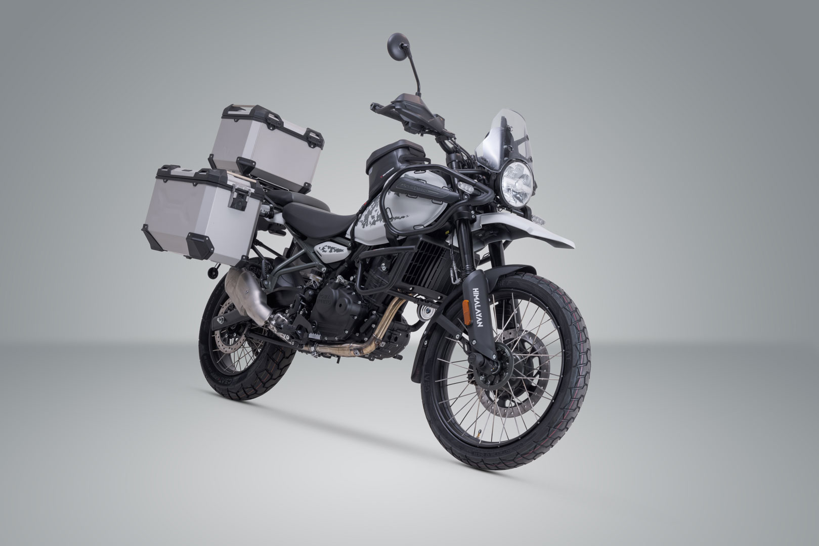 Das Adventure Set TRAX ADV enthält die zur Royal Enfield Himalayan 450 passenden PRO-Seitenträger und das passende ADVENTURE-RACK. Die Seitenträger und der Gepäckträger werden an den modellspezifischen Anbaupunkten befestigt und bieten sicheren Halt für die schwarzen TRAX ADV Alukoffer.