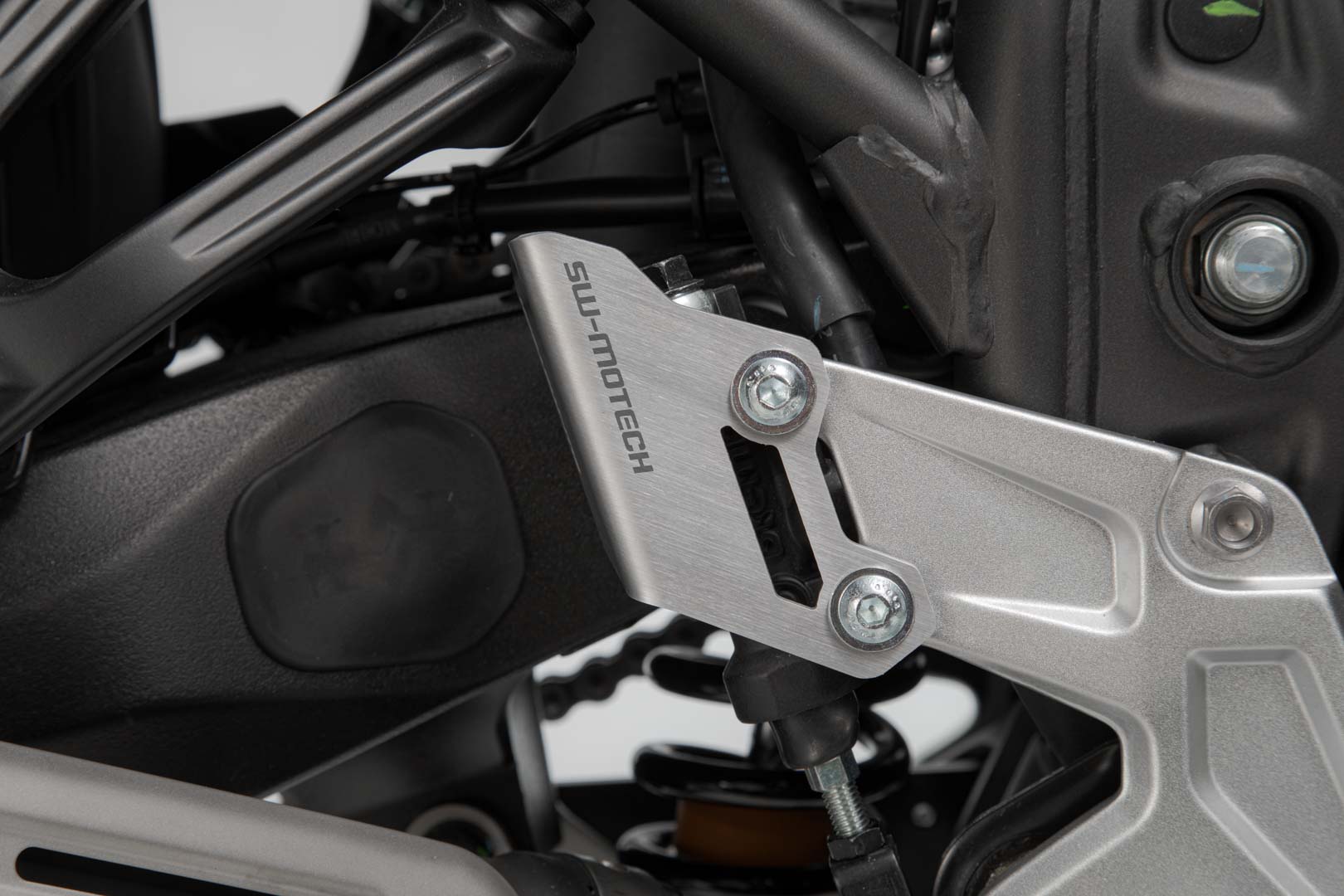 Der aus Aluminium gekantete und gelaserte Protektor schützt den Fußbremszylinder der Yamaha Ténéré 700 – auch vor ungewolltem Stiefelkontakt.