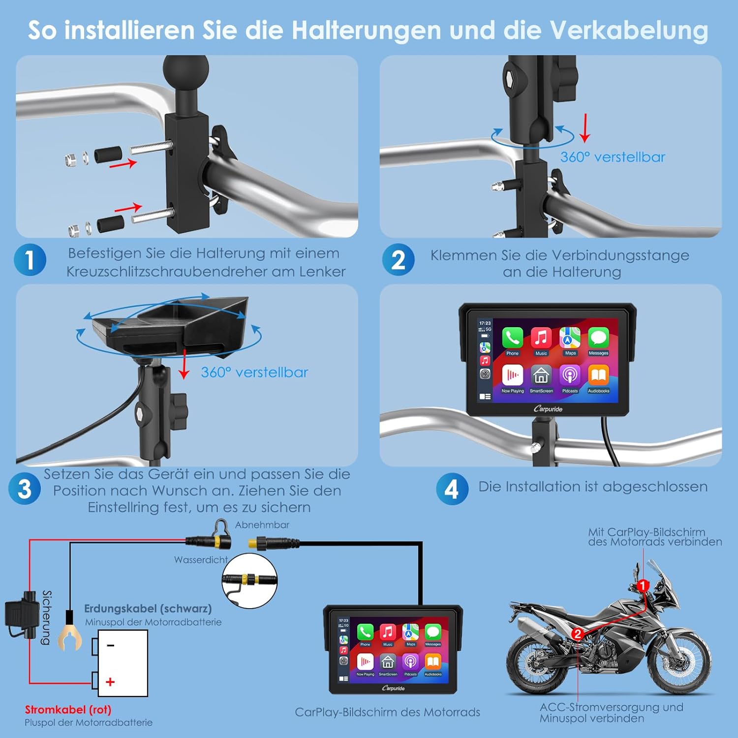 Der tragbare CarPlay-Bildschirm wird mit Halterungssätzen und Werkzeugen für eine einfache Installation geliefert. Der speziell entwickelte Halterungssatz und das Schraubsystem ermöglichen die mühelose Montage des Bildschirms an jedem Motorrad. Sie können ihn sicher am Motorradgriff befestigen und so eine stabile und bequeme Einrichtung gewährleisten.