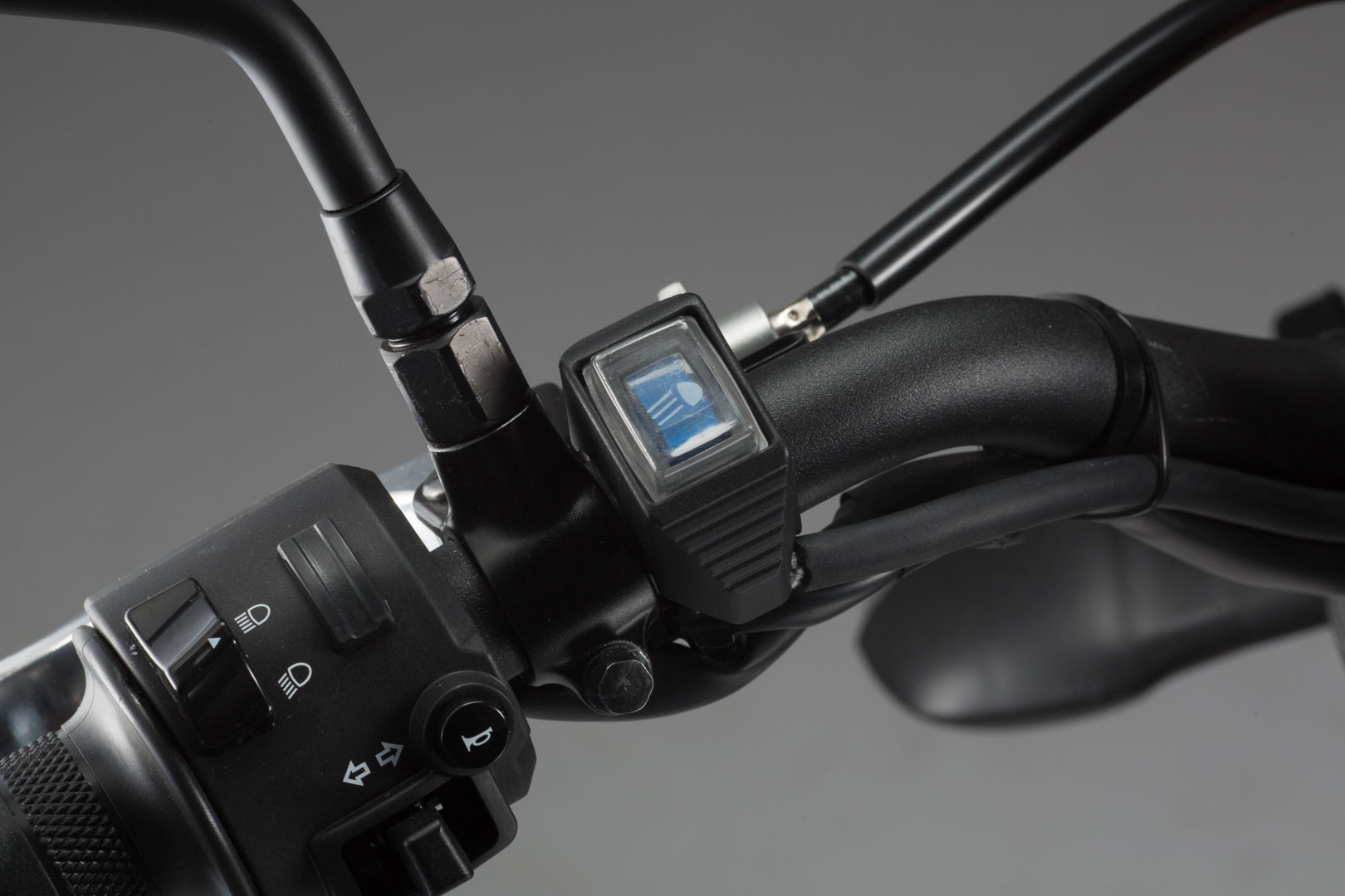 Der blau beleuchtete, spritzwassergeschützte On-/Off -Schalter wird über ein isoliertes Kabel mit drei Steckverbindungen angeschlossen. Montieren lässt sich der kompakte Schalter an Rohrlenkern mit Ø 22 mm bis 1 Zoll (25,4 mm).