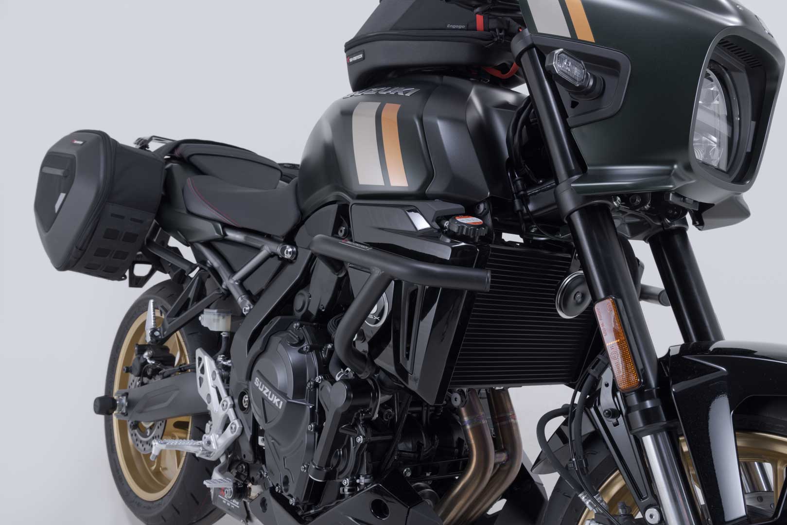 Passend für die Suzuki GSX-8T / TT werden die Sturzbügel mit witterungs- und korrosionsbeständiger Pulverbeschichtung in Schwarz angeboten. Die Oberflächenveredelung erfolgt in einer hochmodernen Anlage im SW-MOTECH Werk im tschechischen Brünn.