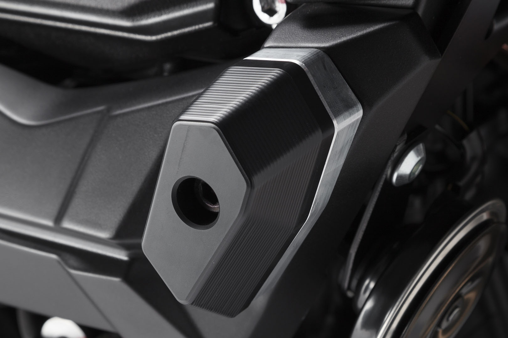 Zusätzlichen Schutz im Falle eines Sturzes geben Rahmen-Sturzpads. Form, Oberfläche und Material sorgen für hervorragende Gleiteigenschaften und verringern Schäden am Motorrad. Die robuste Alu-Unterkonstruktion lässt sich leicht montieren und bei Bedarf lassen sich die CNC-gefrästen Schleifpads aus abriebfestem Polyamid schnell austauschen.
