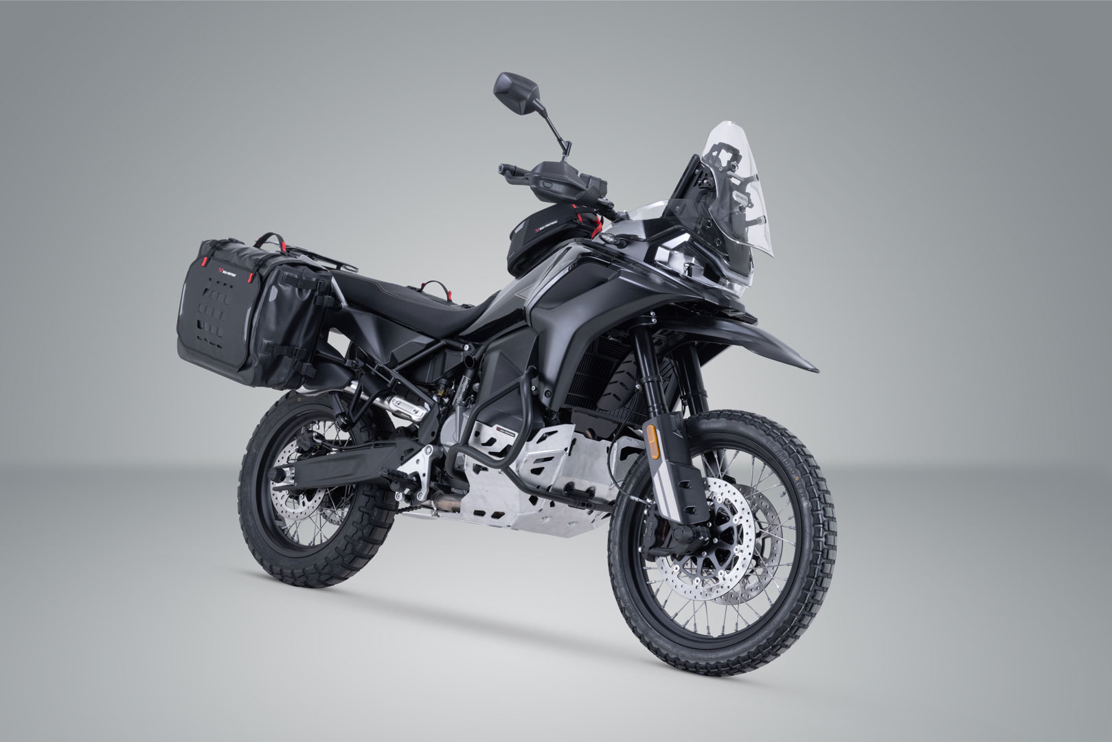 Mit dieser Kombination von PRO Seitenträgern und den SysBag WP L Taschen macht SW-MOTECH die CFMoto 800MT-X startklar für das nächste Motorrad-Abenteuer. Die belastbaren und abnehmbaren Träger geben den wasserdichten Offroad-Taschen optimalen Halt in jedem Terrain.