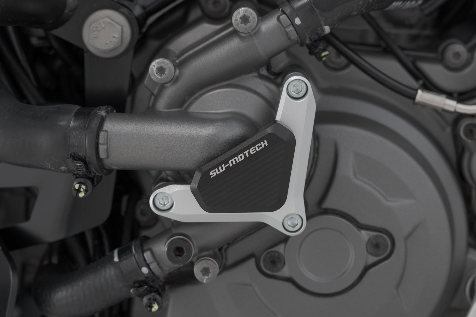 Der passend zum Erscheinungsbild des Motorrads konstruierte Protektor kann die Wasserpumpe bei ungewolltem Bodenkontakt vor Beschädigungen schützen.